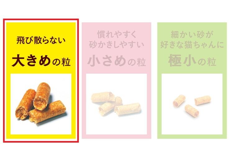 猫ちゃんの手足に挟まりにくい、飛び散らない大きめの粒です。