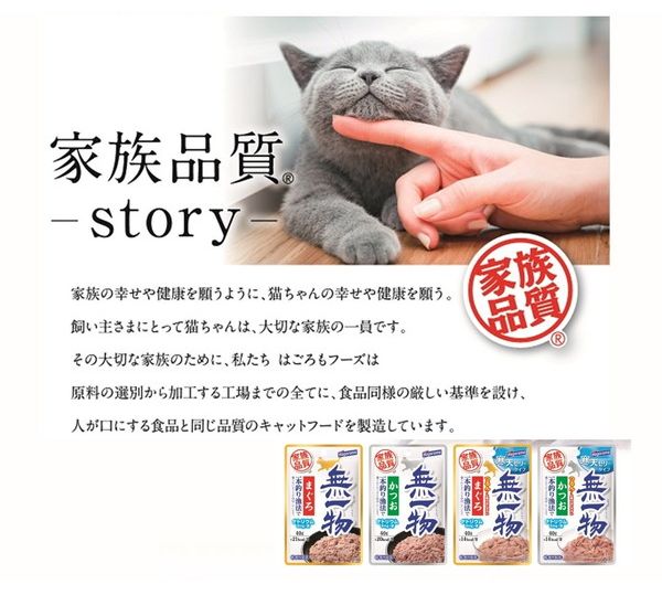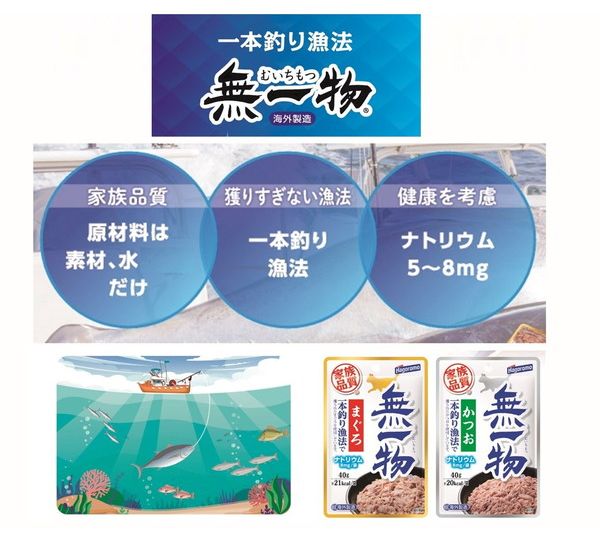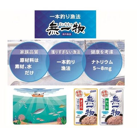 一本釣り漁法で獲ったまぐろと水だけで仕上げた水煮タイプの無添加キャットフードです、食品と同じ原料を使用して仕上げた家族品質です。