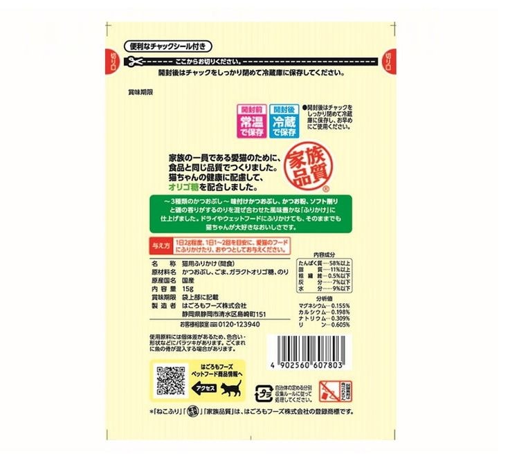 3種類のかつお節にのりをブレンドした風味豊かな猫用ふりかけ。健康に配慮してオリゴ糖を配合。