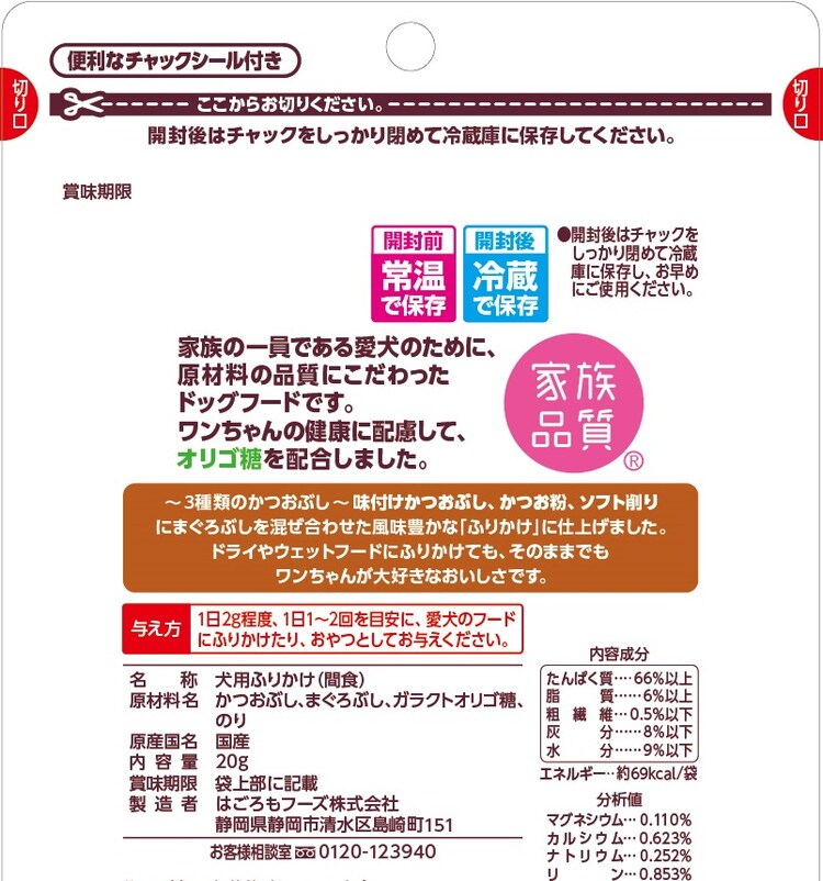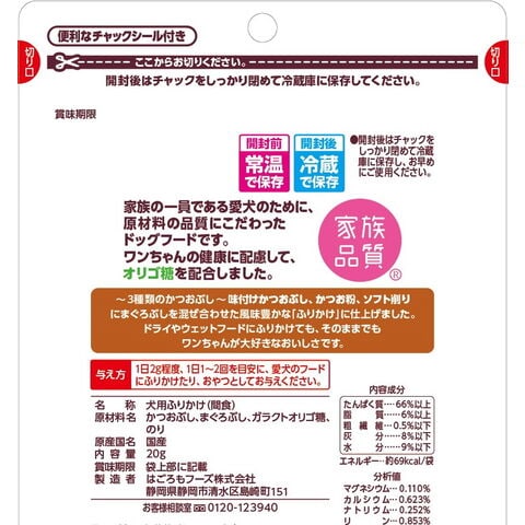 わんちゃん用のふりかけです。風味豊かな3種類のかつお節とまぐろ節でわんちゃんが大好きな美味しさです。