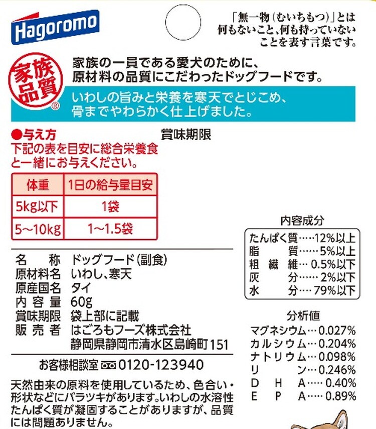 たんぱく質12%以上、脂質5%以上、粗繊維0.5%以下、灰分2%以下、水分79%以下