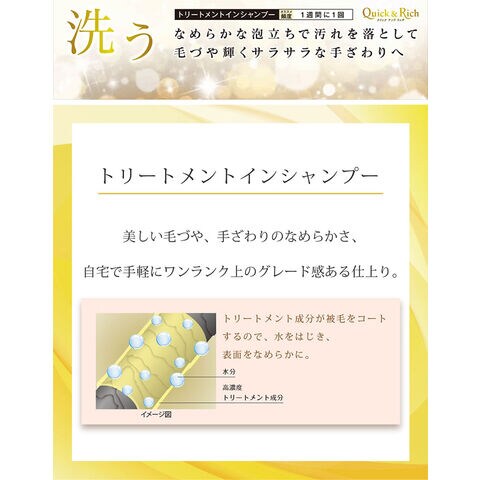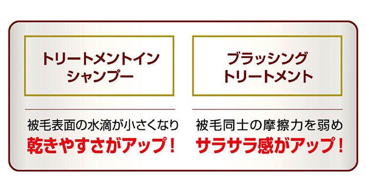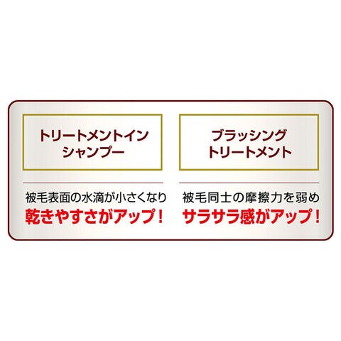 高密度トリートメント成分が被毛をしっかりコート。水切れが良く、被毛の乾きが速い。