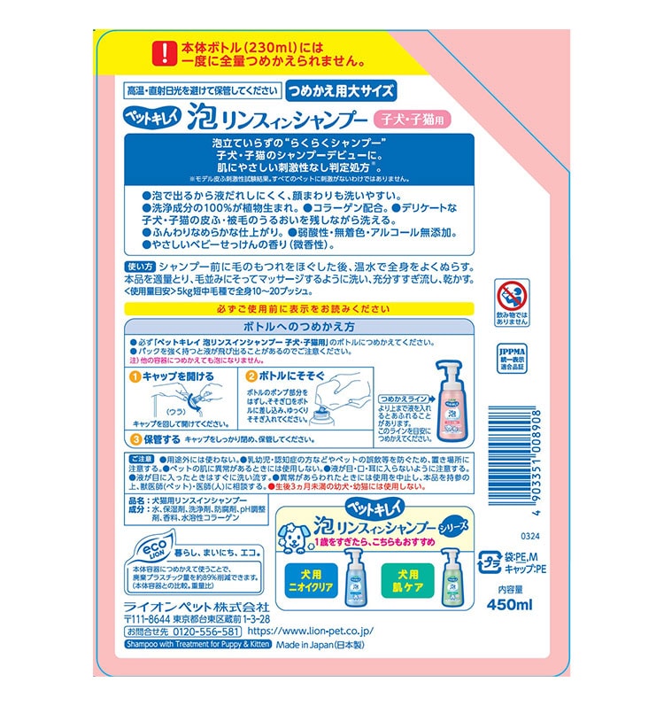 ライオンペット ペットキレイ 泡リンスインシャンプー 子犬子猫用 詰替 大 450ml【ポイント10倍】