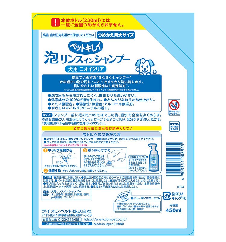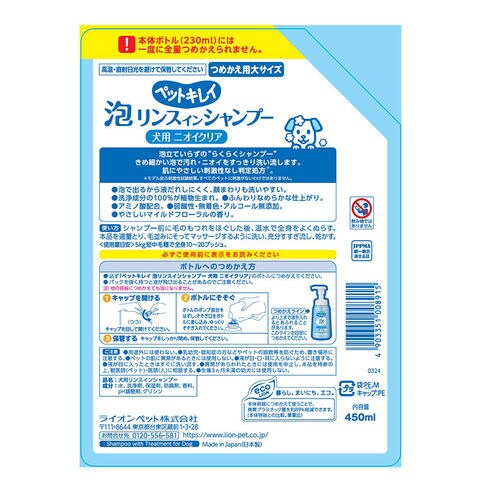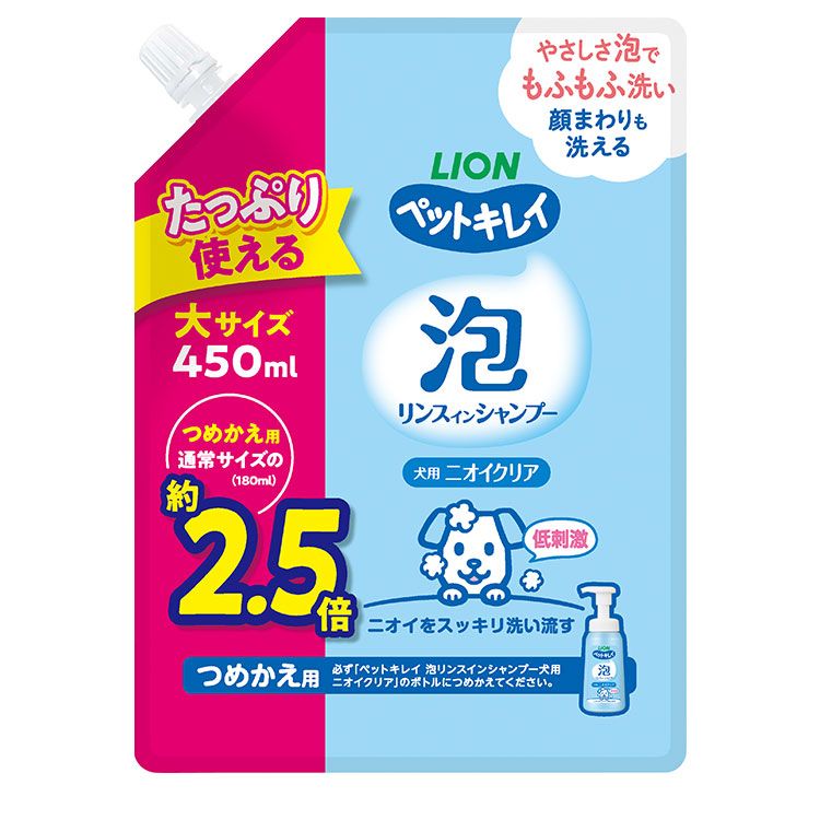 ライオンペット ペットキレイ 泡リンスインシャンプー 犬用 ニオイクリア 詰替 大 450ml【ポイント10倍】