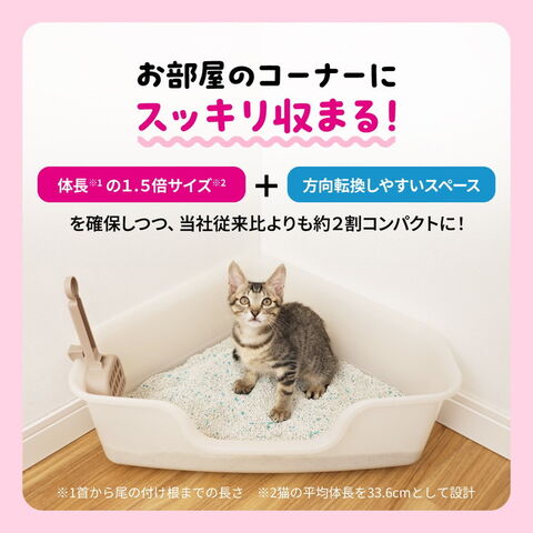 コーナーに置けスペースをとらないので、獣医師が推奨するトイレ設置台数「頭数+1台」におすすめ。