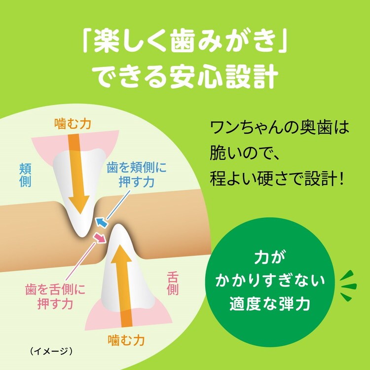 スリット構造が歯面に密着し、噛むことで歯垢を除去。噛む力がかかり過ぎない適度な弾力でしっかり噛める。