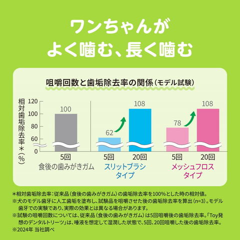 スリット構造が歯面に密着し、噛むことで歯垢を除去。噛む力がかかり過ぎない適度な弾力でしっかり噛める。