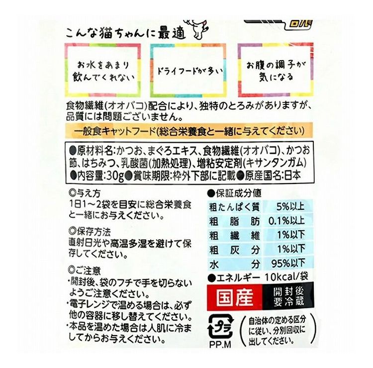 かつお、まぐろエキス、食物繊維(オオバコ)、かつお節、はちみつ、乳酸菌(加熱処理)、増粘安定剤(キサンタンガム)