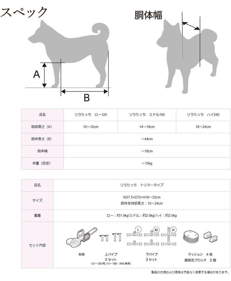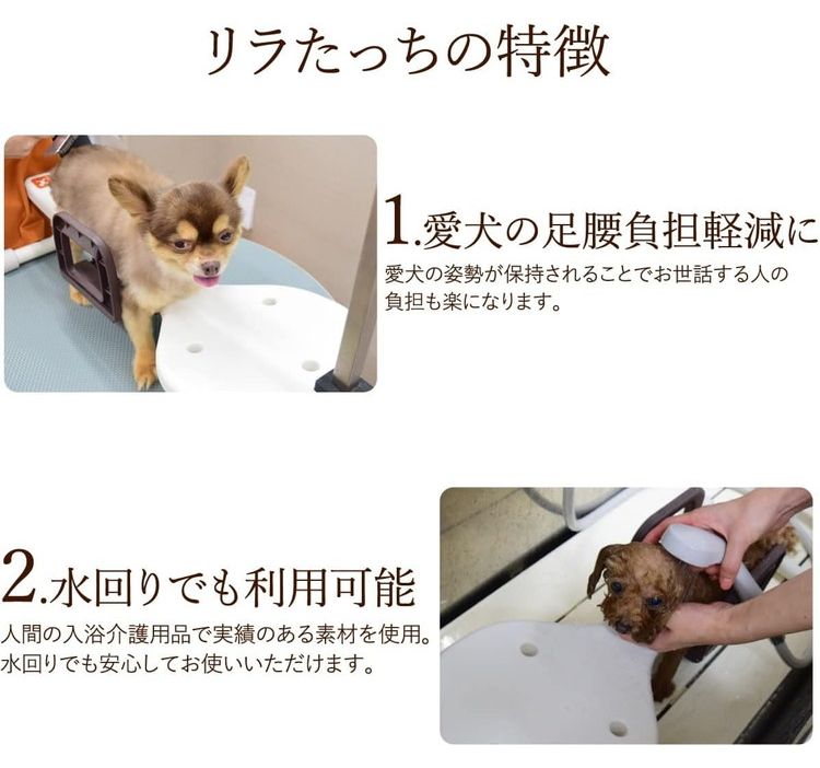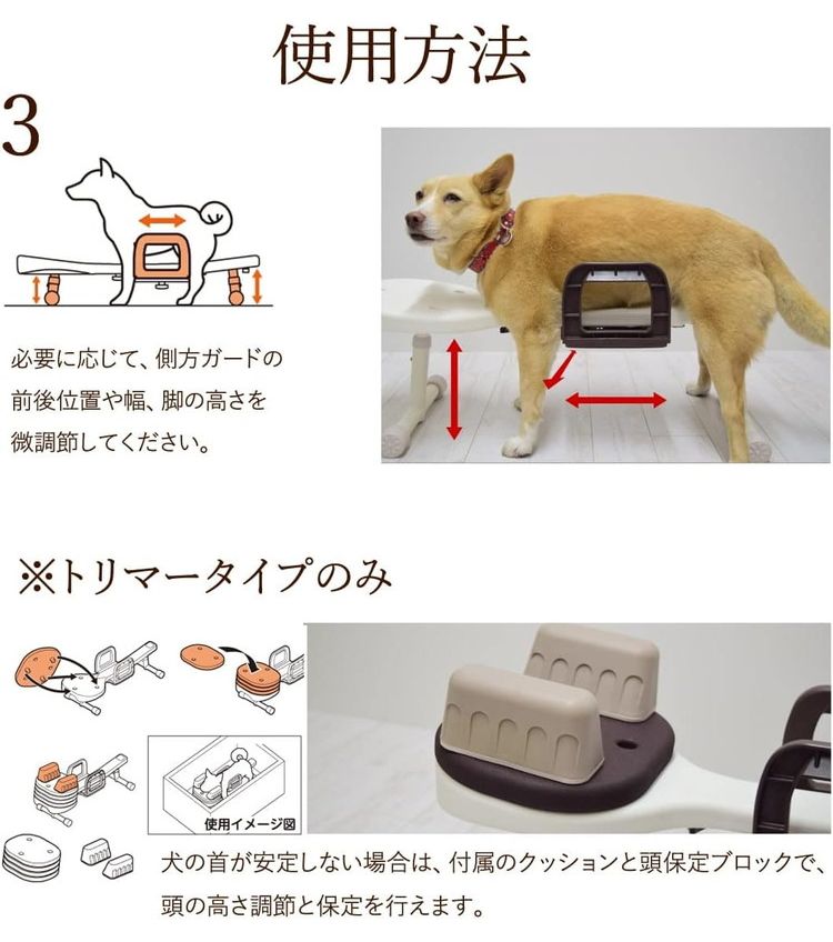 下肢の弱い犬の体を支えて安心グルーミング。シャンプーやトリミングの一人作業を補助します。小型犬を飼われているご家庭用として、高さ調整足が1つ付属します。(胴体支持部高さ調整範囲:10~12cm)