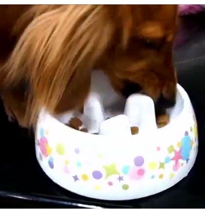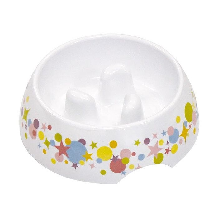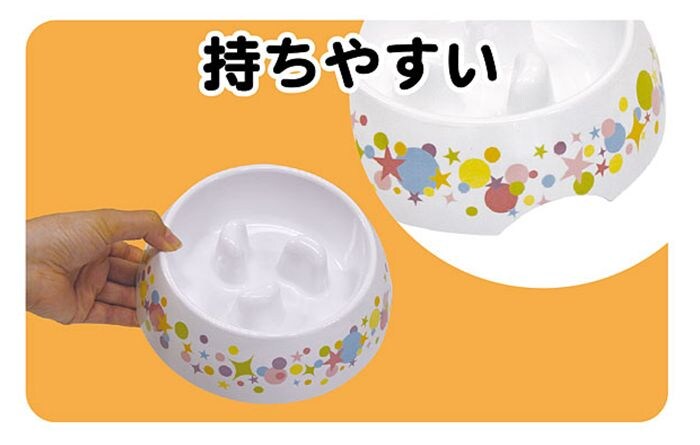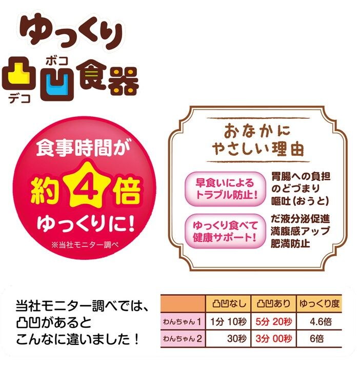 ●お食事にゲーム感覚、愛犬の早食いSTOP!一気に食べられない凸凹構造で、食事時間が約4倍ゆっくりに。(当社モニターテスト結果より)●突起物はフチに接することなく独立しているのでフードをこぼしたりしにくく、フチに集めたりもできず、食事に時間をかける。●丈夫で重量感もあり、人間の食器にもよく使われるメラミン樹脂製。●熱湯消毒対応。傷つきにくい。すべり止め付き。●フード容量目安は約60g。