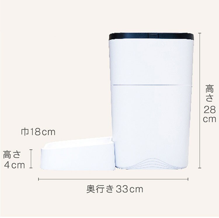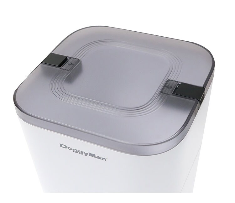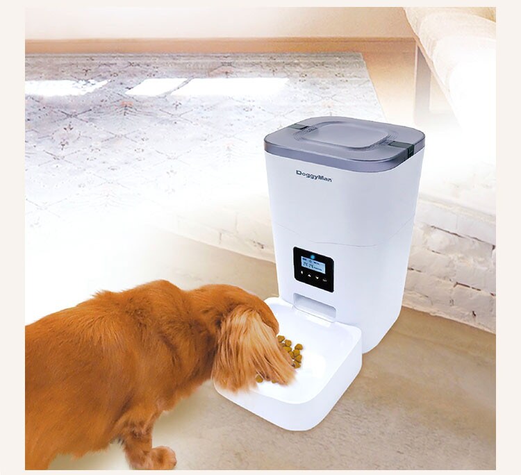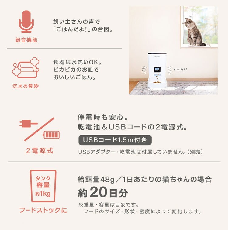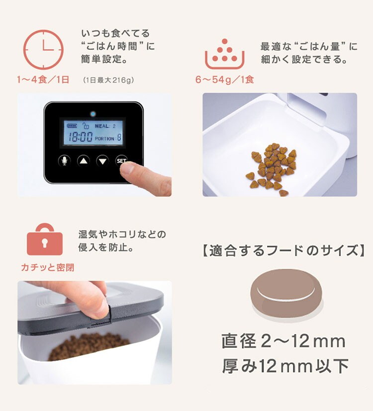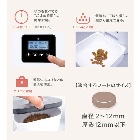 タンク容量約1kg(3L)のフードストッカーがついたドライフード専用自動食器/自動給餌機。