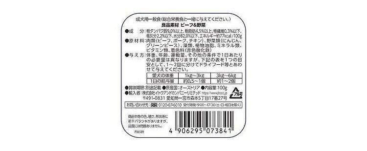 肉類(ビーフ、ポーク、チキン、ターキー)、野菜類(にんじん、グリンピース)、じゃがいも、ビタミンD3、ミネラル類、増粘安定剤(カラギーナン)、植物性油脂、着色料(赤色酸化鉄)