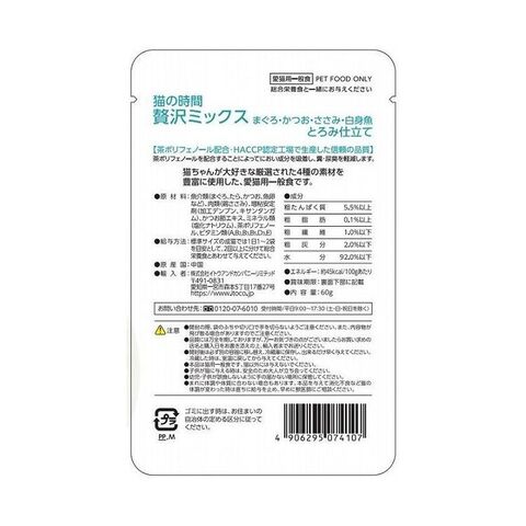 魚介類(まぐろ、たら、かつお、魚卵など)、肉類(鶏ささみ)、増粘安定剤(加工デンプン、キサンタンガム)、かつお節エキス、ミネラル類(塩化ナトリウム)、茶ポリフェノール、ビタミン類(A、B2、B3、B5、D3、E)