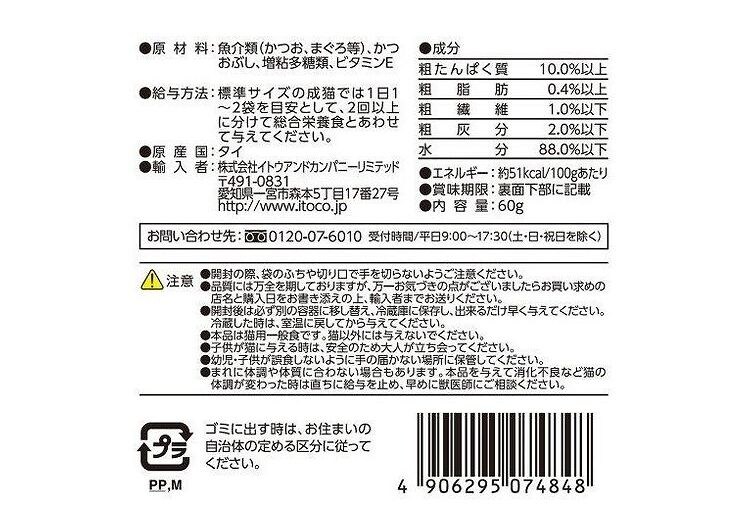 魚介類(かつお、まぐろ等)、かつおぶし、増粘多糖類、ビタミンE