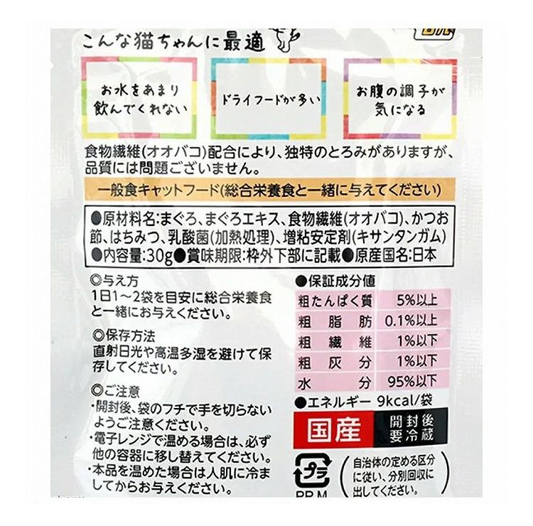 まぐろ、まぐろエキス、食物繊維(オオバコ)、かつお節、はちみつ、乳酸菌(加熱処理)、増粘安定剤(キサンタンガム)