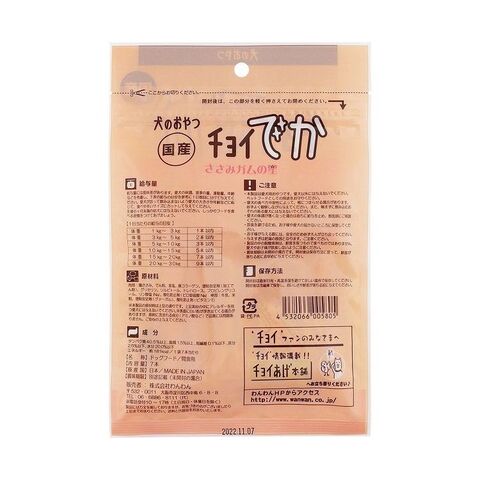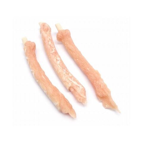 肉部:鶏ささみ、コーンスターチ、食塩、豚コラーゲン、増粘安定剤(加工でん粉)、グリセリン、ソルビトール、トレハロース、プロピレングリコール、リン酸塩(Na)、酸化防止剤(ピロ亜硫酸Na)棒部:牛皮米粉、増粘安定剤(グァガム)、酸化防止剤(ビタミンE)