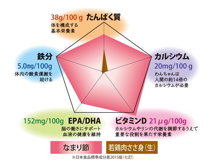 タンパク質30.0%以上、粗脂肪0.8%以上、粗繊維0.5%以下、粗灰分1.5%以下、水分65.0%以下、エネルギー(100g当り)150Kcal