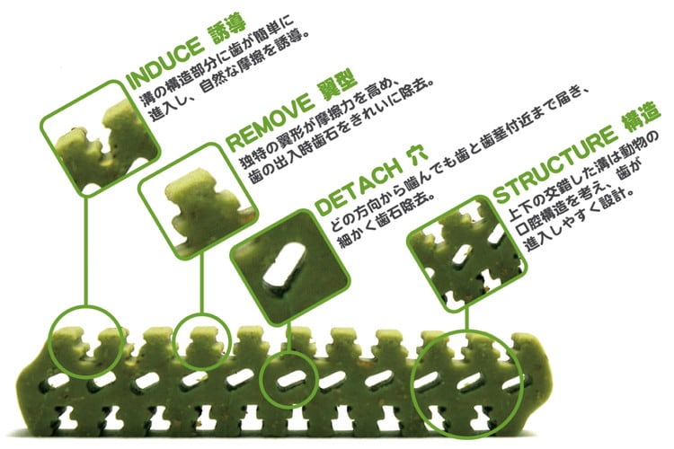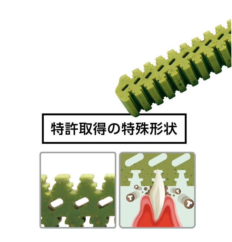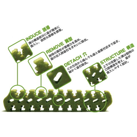 ●ワンちゃんの歯と歯茎の健康を守るガムです。人でも食べられる原材料を使っているので安心して与えることができます。どの方向から-んでも溝に歯が自然とはまり、やさしい摩擦を誘導して汚れを除去します。EXには口臭に効果があるクロレラパセリ配合、健康に良いビタミンミックス配合。