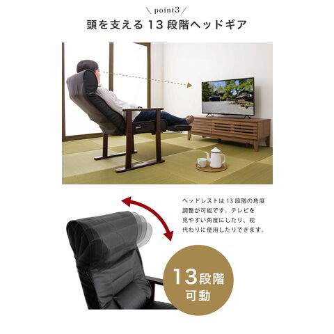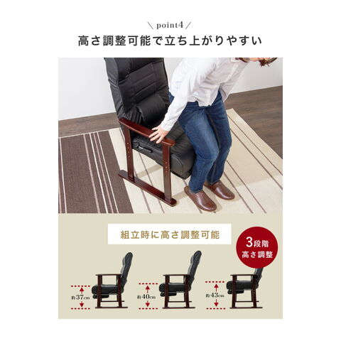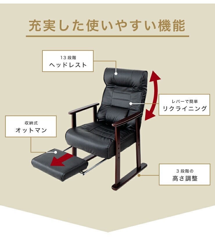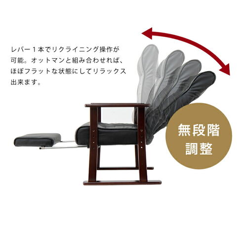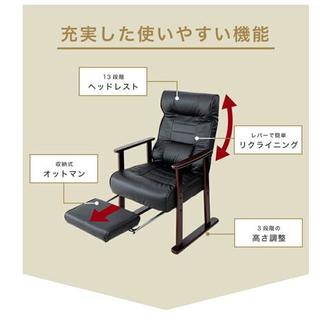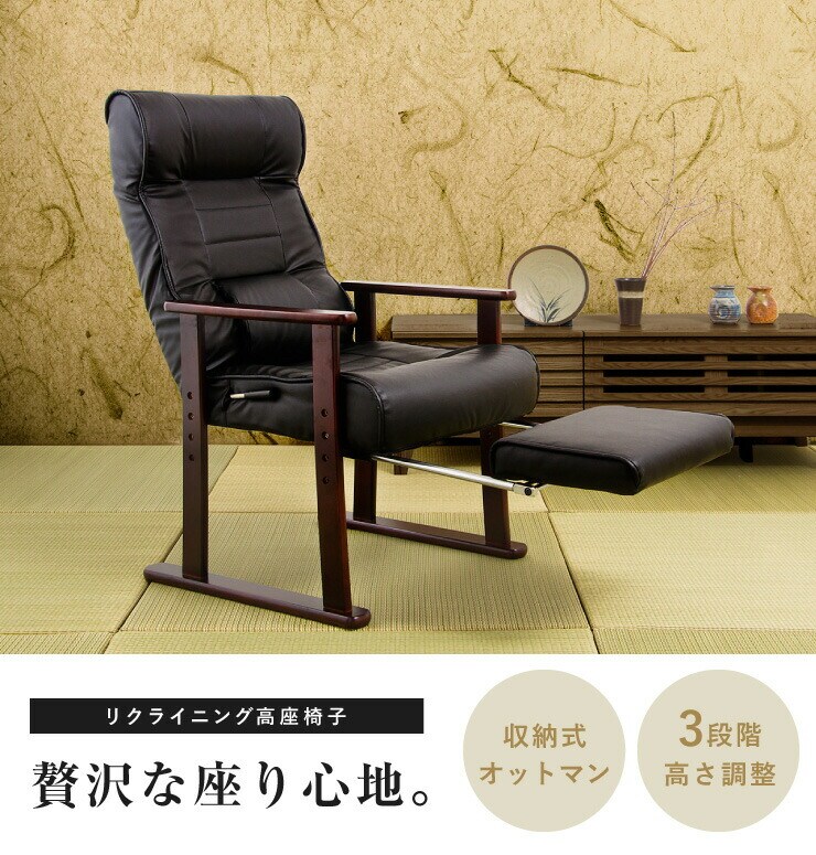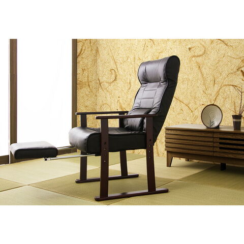 木製肘付リクライニング高座椅子(フットレスト付) ヘッドレスト 肘掛 椅子 高齢者 介護 立ち座り 和室 レバー オットマン 黒【送料無料】