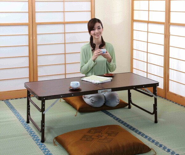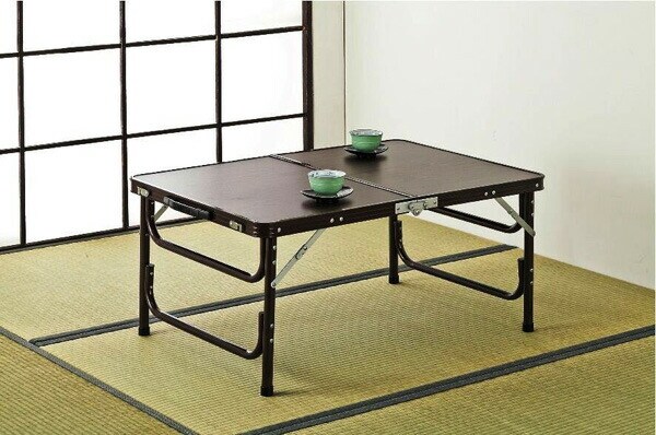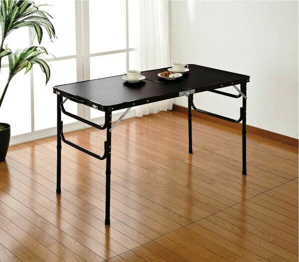 落ち着いた木目調が簡易テーブルだと感じさせない秘密です。付属の延長パイプを使えば、高さの調節も出来ます。収納時サイズ:60×45×7cm