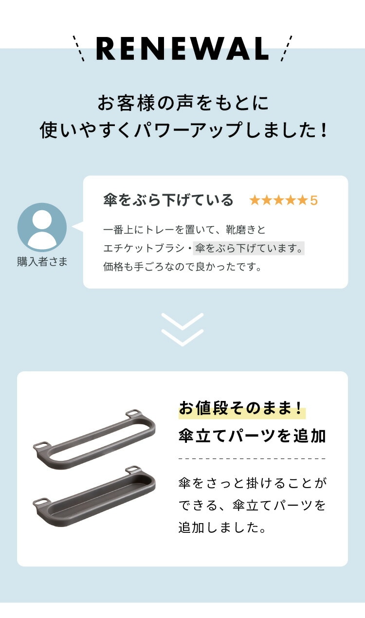・傘立て、小物トレー付きで玄関をさらにスッキリ整えます。