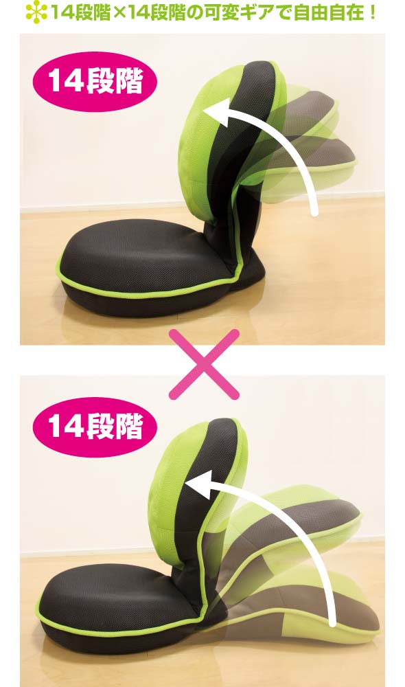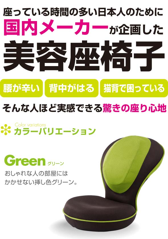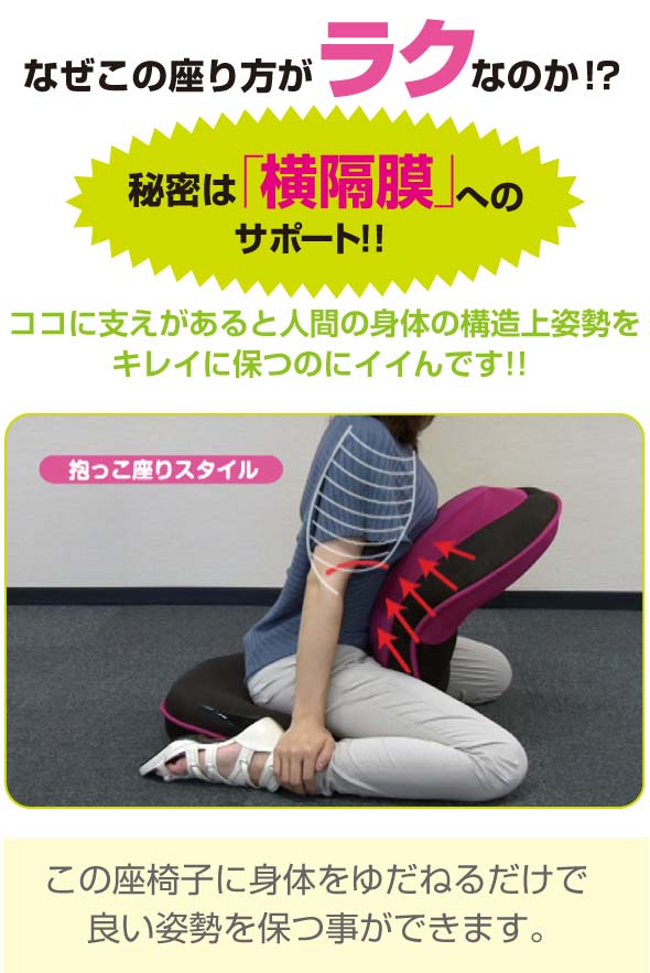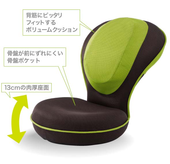 腰が辛い、背中がはる!そんな人ほど実感できる長時間離れられなくなる居心地良いプライベート座椅子【背筋がGUUUN美姿勢座椅子】◆肉厚クッション+2つの14段階リクライニング!背もたれのリクライニングはもちろん背中クッションがなんと90度に曲がっちゃうんです。この【背筋がGUUUN美姿勢座椅子】は2通りの使い方ができます。<ストレッチ>ひとつは背面にして、肩甲骨を開くようにストレッチする方法。こうすることで、凝り固まった筋肉を和らげ、ゆがんだ背中をほぐしてくれます。<リラックス>さらに、もうひとつの使い方は抱っこするように抱え込んで座る方法です。特に姿勢、腰と深い関わりのある横隔膜が弱っている人は内側に丸まりがちですね。この美姿勢座椅子は体の前にバーがあるため、これが横隔膜を支えるような役割をしてくれるわけです。色は3色で大人ブラウン、ハイセンスなグリーン、愛らしいピンクです。