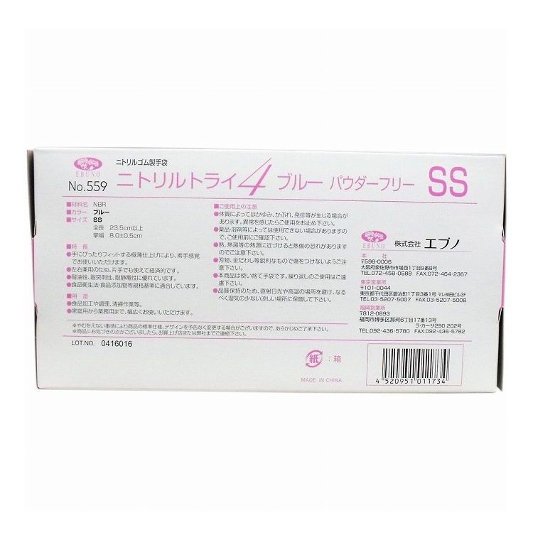 No.559 ニトリルトライ4 ブルー パウダーフリー ニトリルゴム製 使い捨て手袋 SSサイズ 100枚入