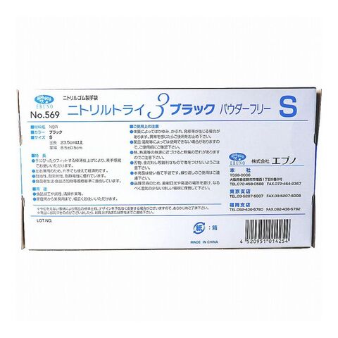 No.569 ニトリルトライ3 ブラック パウダーフリー ニトリルゴム製 使い捨て手袋 Sサイズ 100枚入