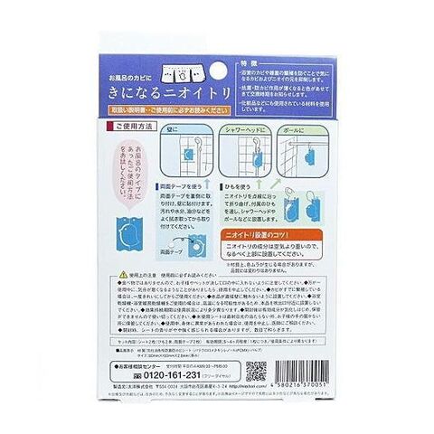 ニオイトリを点線に沿って折り曲げ、付属のヒモを通し、シャワーヘッドやポールなどに設置します。