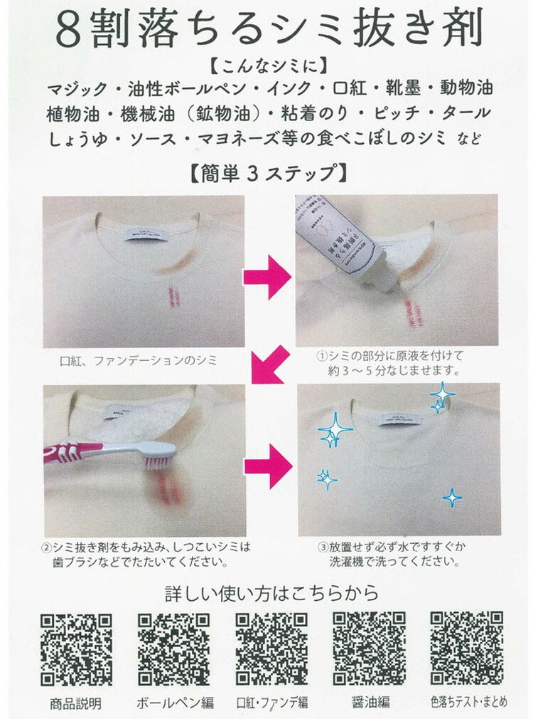 マジック、油性ボールペン、インク、口紅、粘着のり、ワイン、しょうゆ、ソース、マヨネーズ、サラダ油、ドレッシング、トマトソース等の食べこぼしのシミなど
