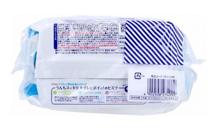 ※トイレに流す場合は、1~2枚ずつ「大」の水量で流してください。このティシュは水流の力でほぐれるので、水流が弱いとトイレに詰まる可能性があります。