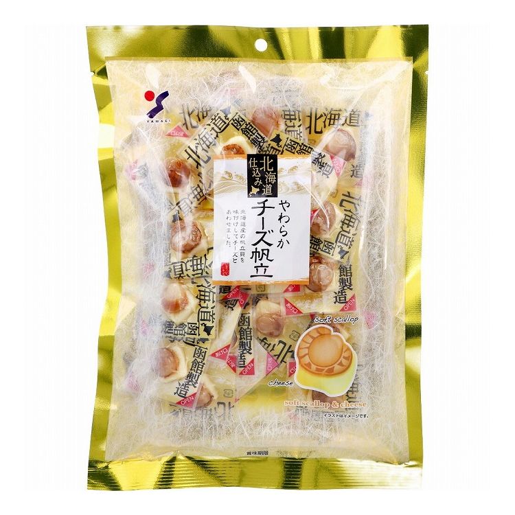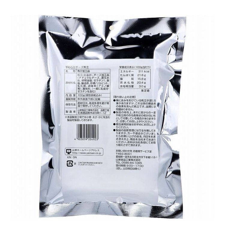 帆立(北海道)、チーズ加工品(ナチュラルチーズ、還元水飴、植物油脂、ゼラチン)、食塩、醸造酢、砂糖/ソルビット、乳化剤、調味料(アミノ酸等)、酸味料、(一部に乳成分・ゼラチンを含む)