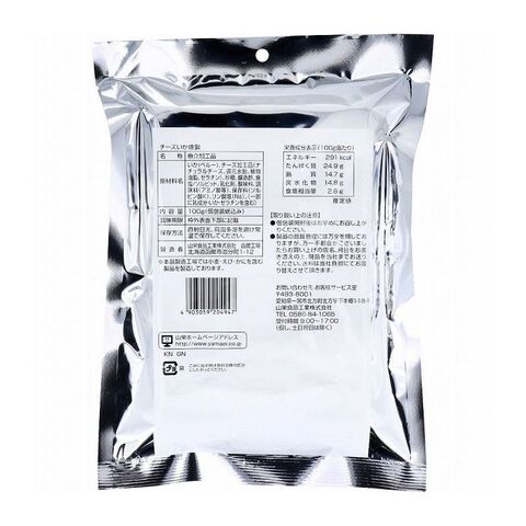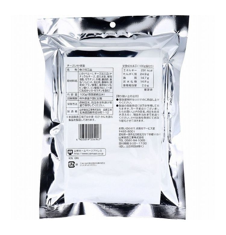 いか(ペルー)、チーズ加工品(ナチュラルチーズ、還元水飴、植物油脂、ゼラチン)、砂糖、醸造酢、食塩/ソルビット、乳化剤、酸味料、調味料(アミノ酸等)、保存料(ソルビン酸K)、リン酸塩(Na)、(一部に乳成分、いか、ゼラチンを含む)