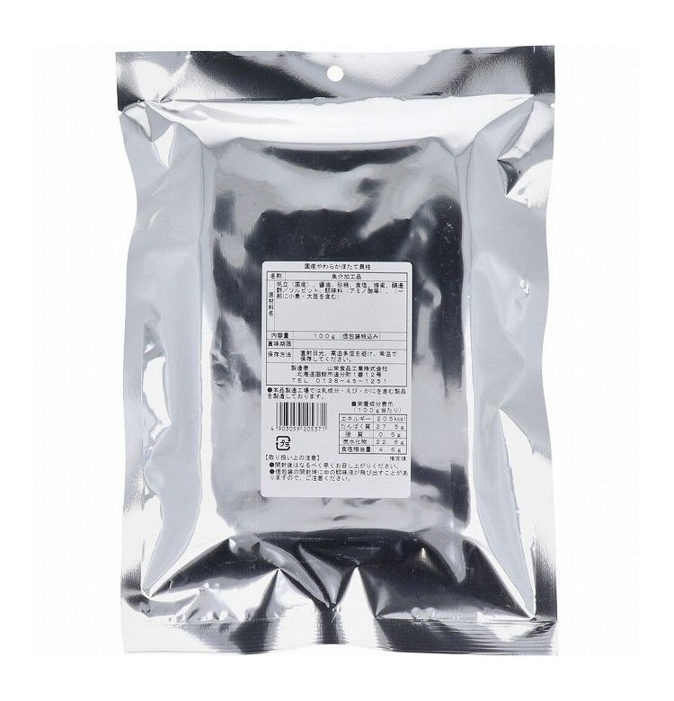 帆立(国産)、醤油、砂糖、食塩、蜂蜜、醸造酢、砂糖/ソルビット、調味料(アミノ酸等)、(一部に小麦・大豆を含む)