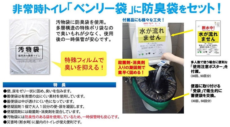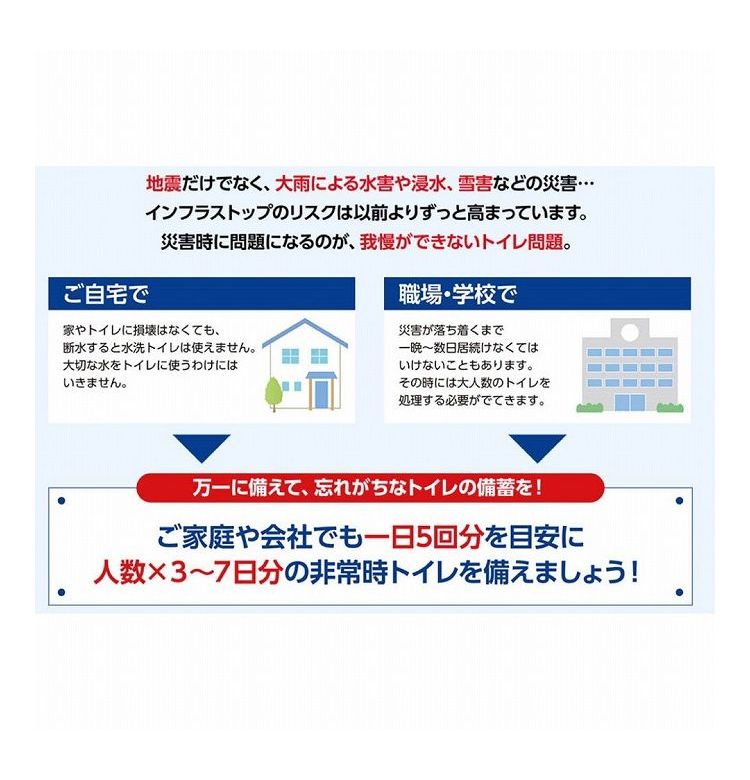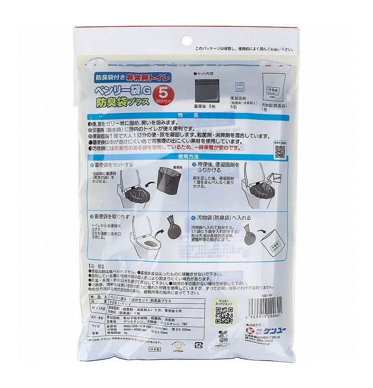 便凝固剤(殺菌剤・消臭剤入) 5包、便袋5枚、汚物袋 (防臭袋) 1枚