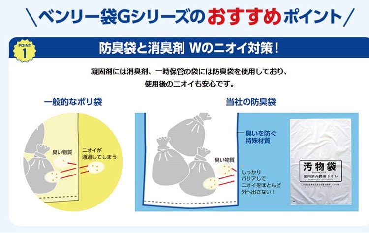 ・防臭袋、消臭剤は臭いを防ぐ能力に優れた材質を使用していますが、すべての臭いを防ぐわけではありません。