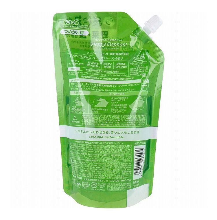 ハッピーエレファント 野菜・食器用洗剤 グレープフルーツ 詰替用2回分 500mL