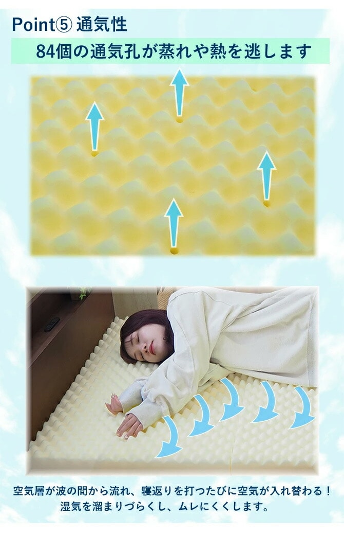 寝返りを打つたび、凹凸構造の波の間から空気が流れて蒸れにくくします。
