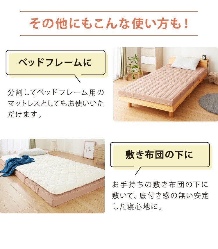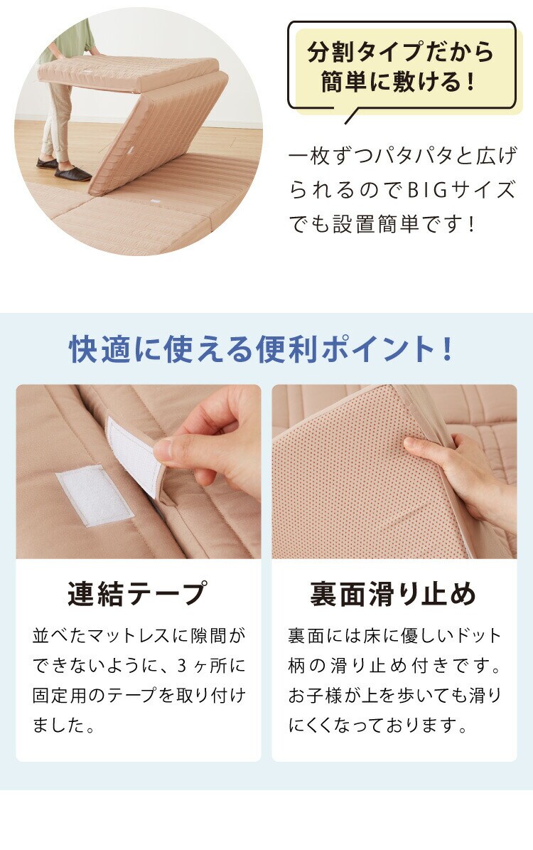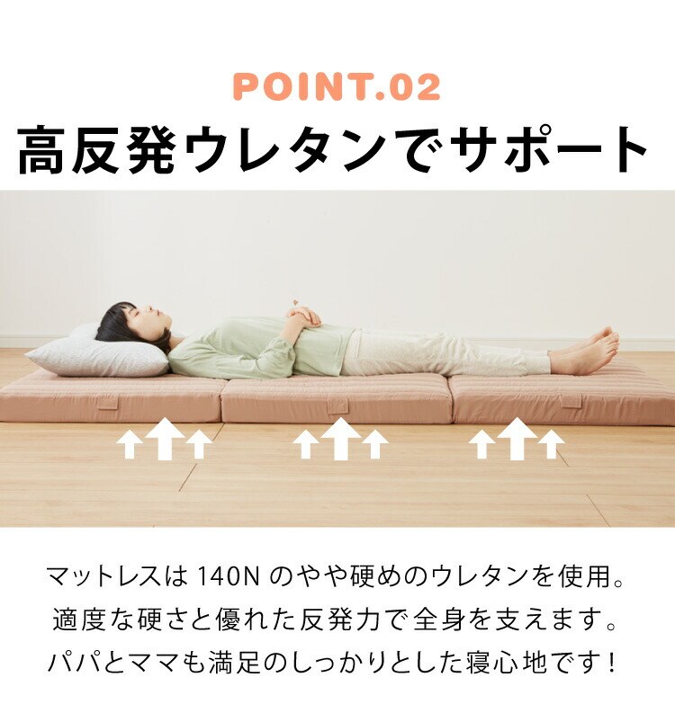 ご使用時は、マットレス同士を面ファスナーで連結。収納時は、連結を外してそれぞれ収納できる三つ折りタイプ。コンパクトな圧縮梱包にてお客様へお届け致します。