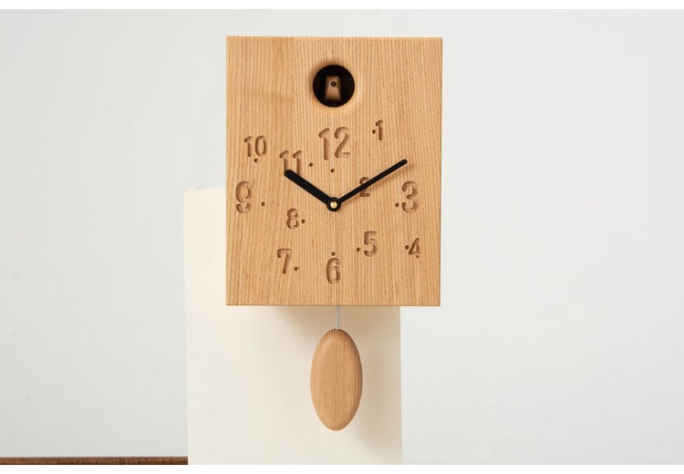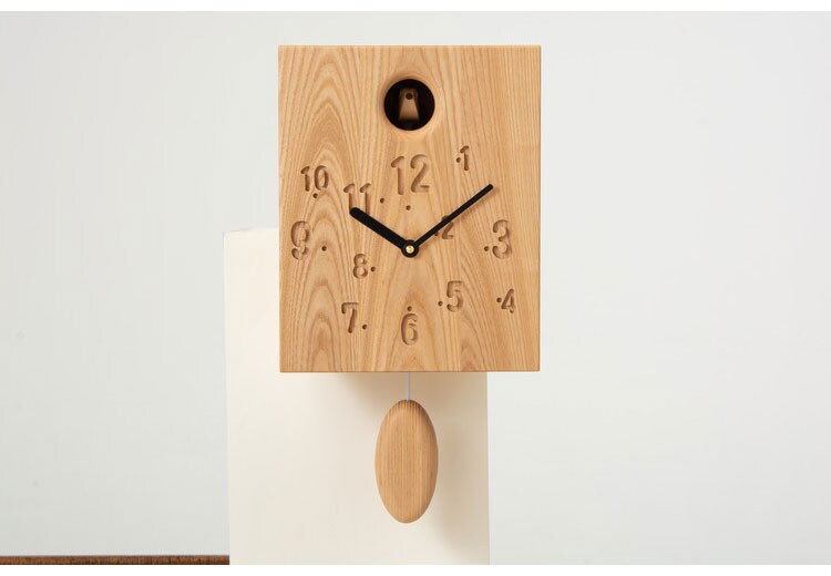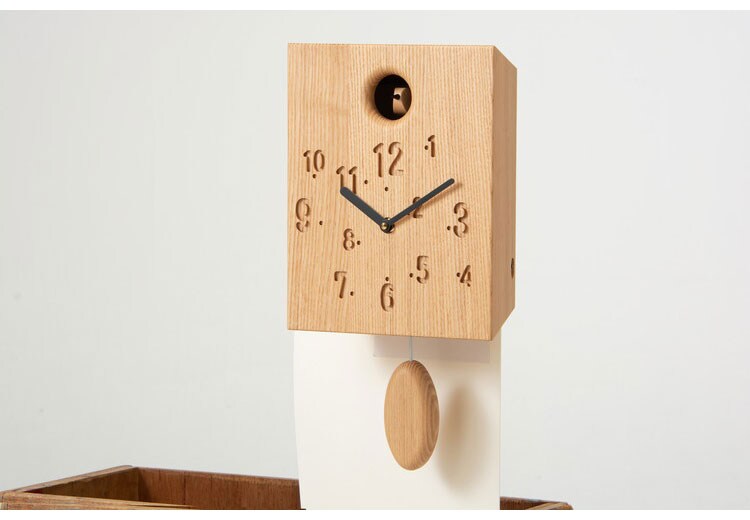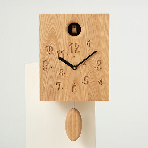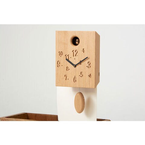 時刻を知らせてくれるのは、メープルとウォルナットでできた手づくりのカッコーです。時報と30分にふいごから出るかわいらしい鳴き声で時間をお知らせします。