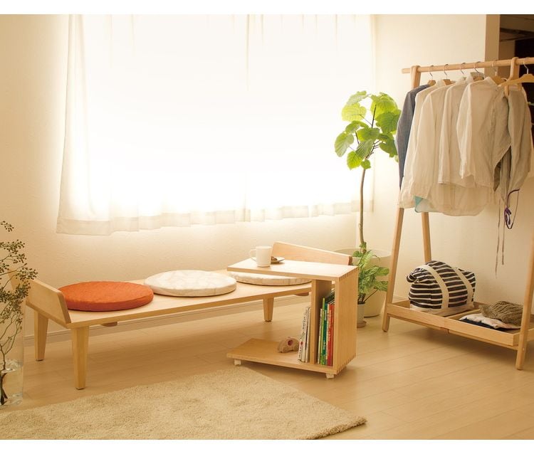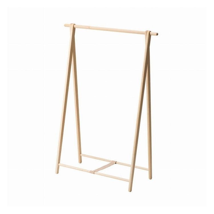 コサインのハンガーで17着以上掛かる収納力と、たたんで移動できる身軽さ、どこに置いてもシンプルで飽きのこない美しいデザインと素材感が特徴です。