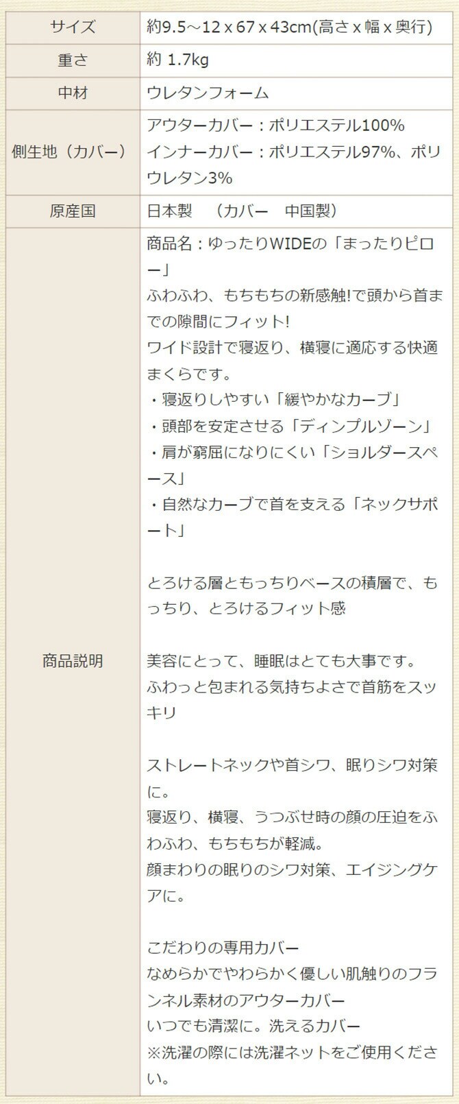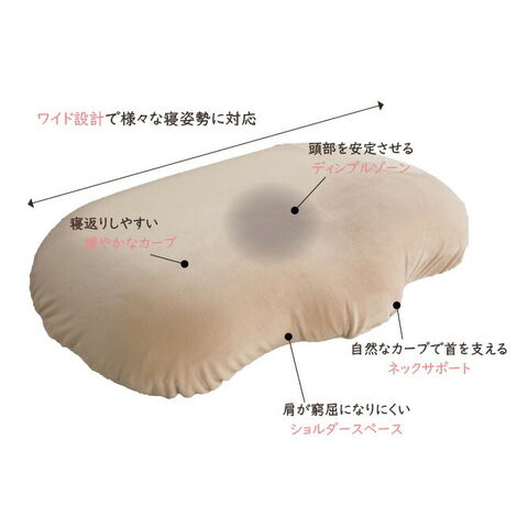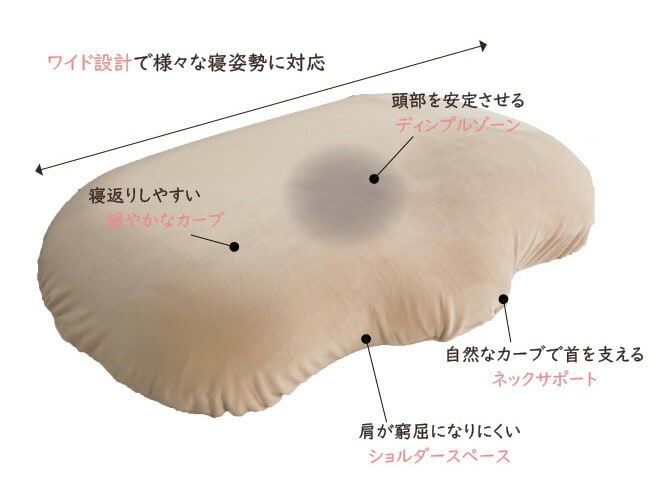 ワイド設計で寝返り、横寝に適応する快適まくらです。