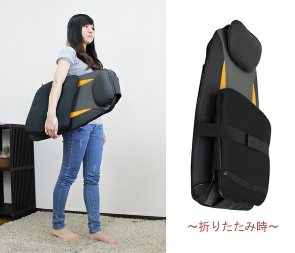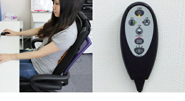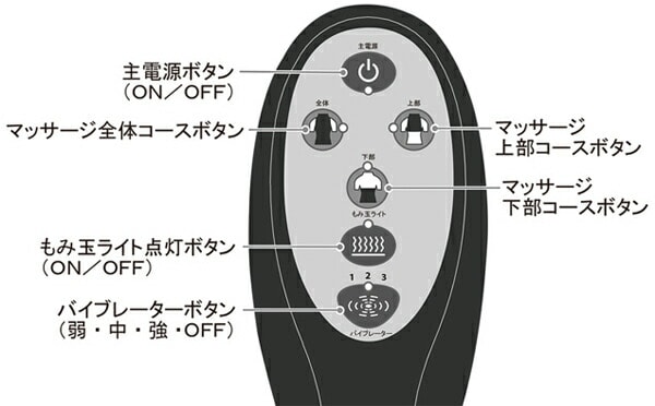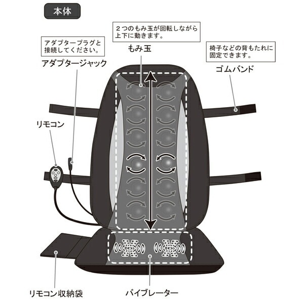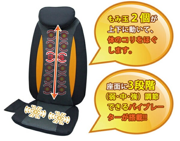 椅子や壁に立てかけ、大小2つのもみ玉が背中・腰などをマッサージしてくれます。また3コースのマッサージが選択できます。座面にバイブレーター(弱・中・強)があり選択できます。