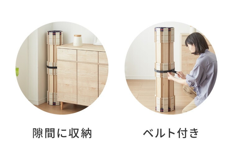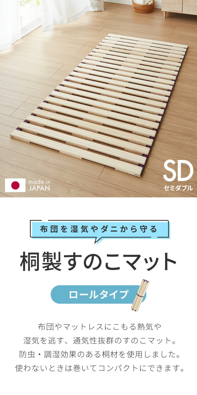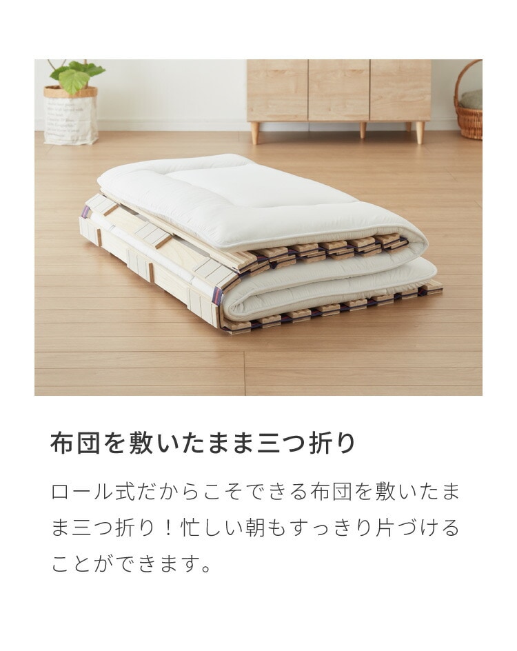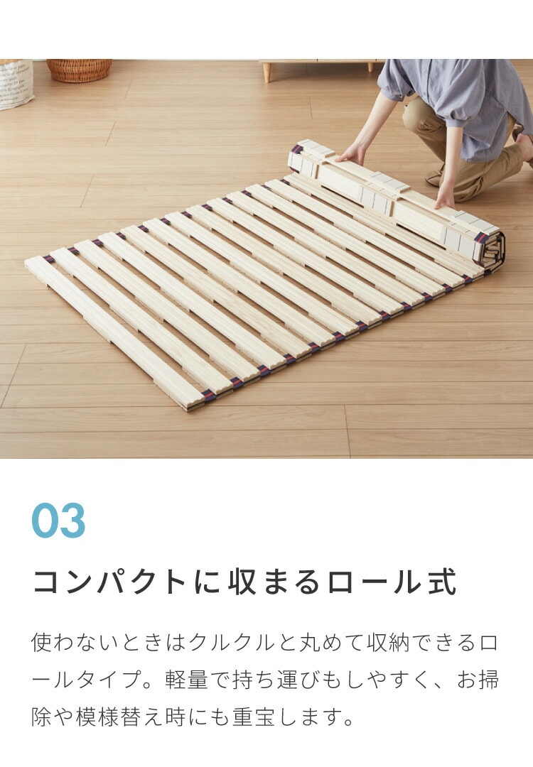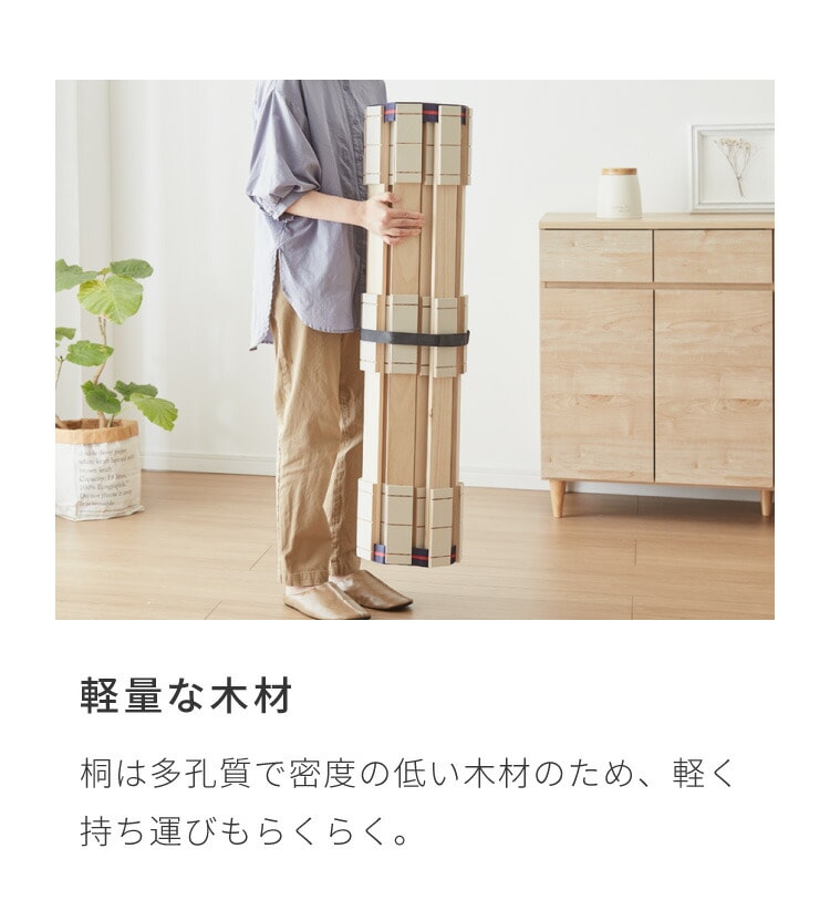 ・桐製スノコのベッドなので布団やマットレスにこもる熱気や湿気を逃し、いつでも快適。巻いてコンパクトにできるロール式。収納や持ち運びもラクラク。