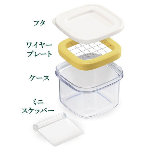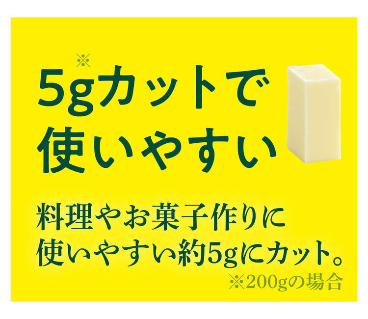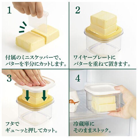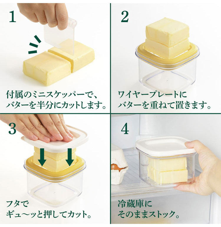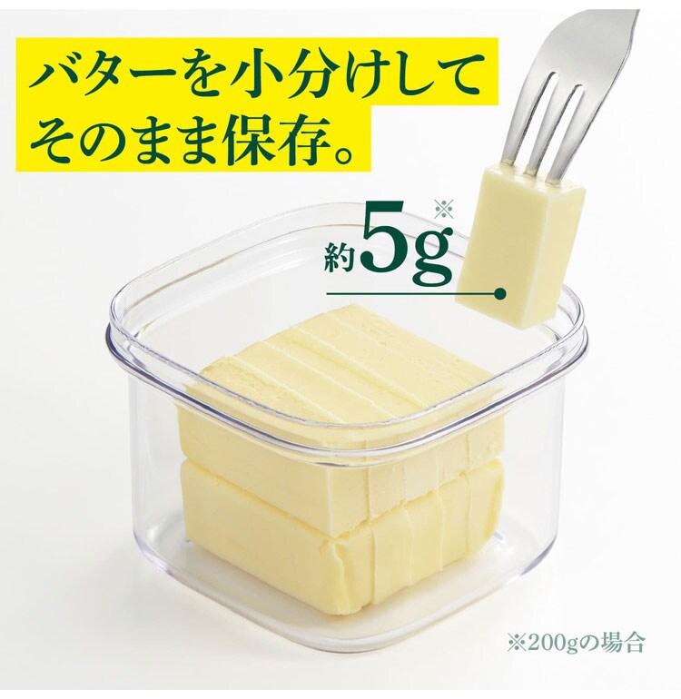 市販のバターは、箱やアルミフィルムが傷みやすくなかなかきれいに使えないものです。「すぐ切れるバターカットケース」なら、ギュッと一押しで約5gにカットでき、そのまま冷蔵庫にストックできます。