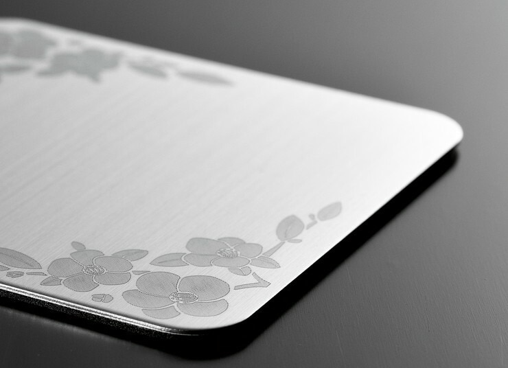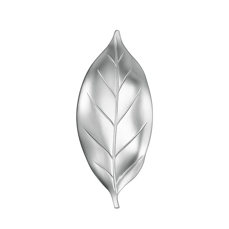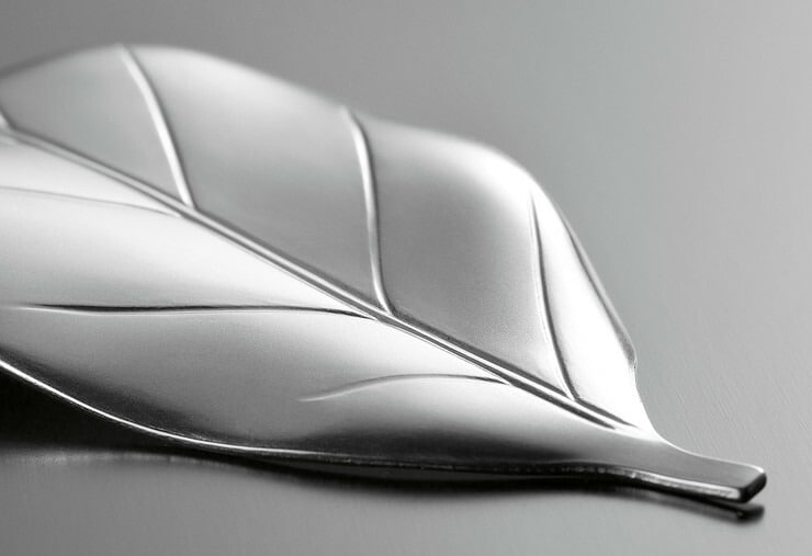 葉しおき:金属加工のまち燕の職人が、椿の葉をステンレスで表現。柔らかな曲線、うねりはそのままに銀白色の葉しおきを作りました。