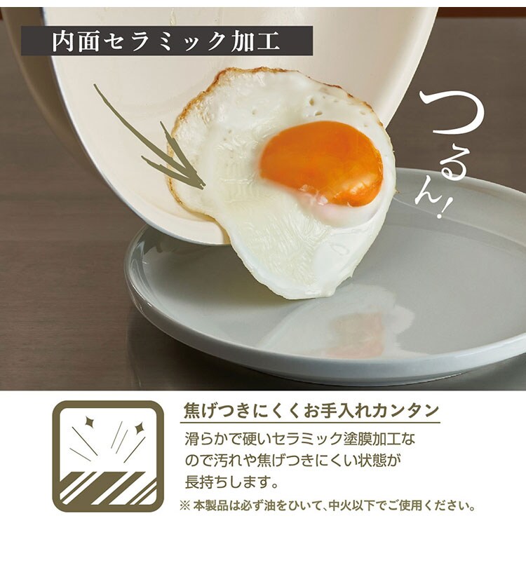 内面をセラミック加工に。遠赤外線効果と熱伝導性で食材にすばやく、均等に熱が伝わります。旨味を逃がさず、外はパリッ!中はふわっとおいしく仕上がります!