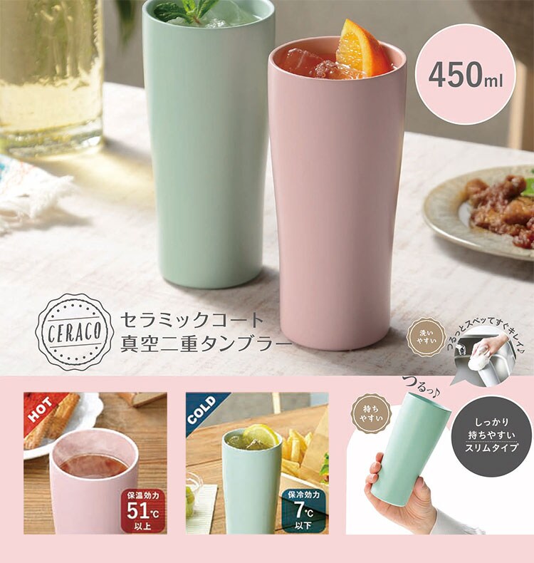 CERACO セラコ セラミックタンブラー 450ml ピンク 真空二重 セラミックコート タンブラー マグ カップ 真空 保温 保冷 スリムタイプ 持ちやすい 汚れ落ち カフェタイム オフィス カクセー【送料無料】