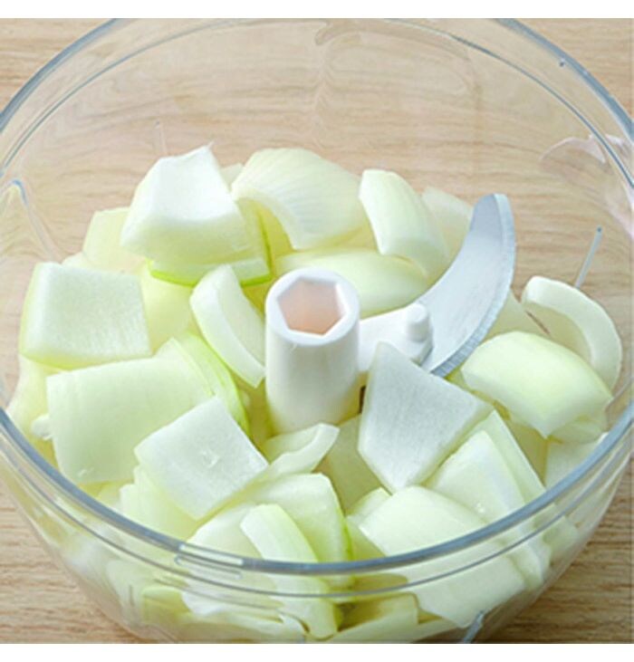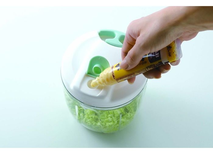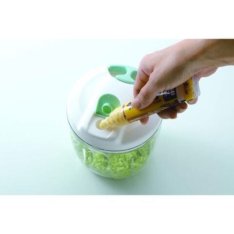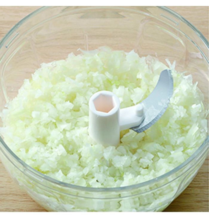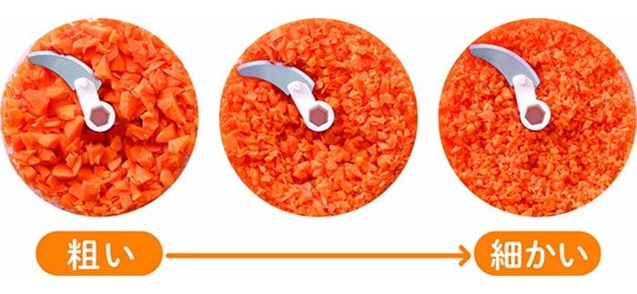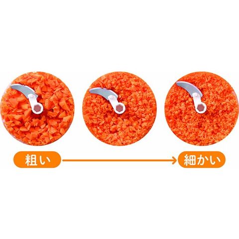 引くだけかんたん!料理のレパートリーが広がります! 時短でラクラク!大きさ自在のみじん切り! まな板から飛び出てしまったり、手にニオイがついてしまったりと、煩わしさのあるみじん切りが、食材を中に入れて数回引っぱるだけ、あっという間に完成! 引く回数によって粗い→細かいを調節可能! ファミリーにも便利なビッグサイズ! 玉ねぎMサイズ1個半が一気にみじん切りに!