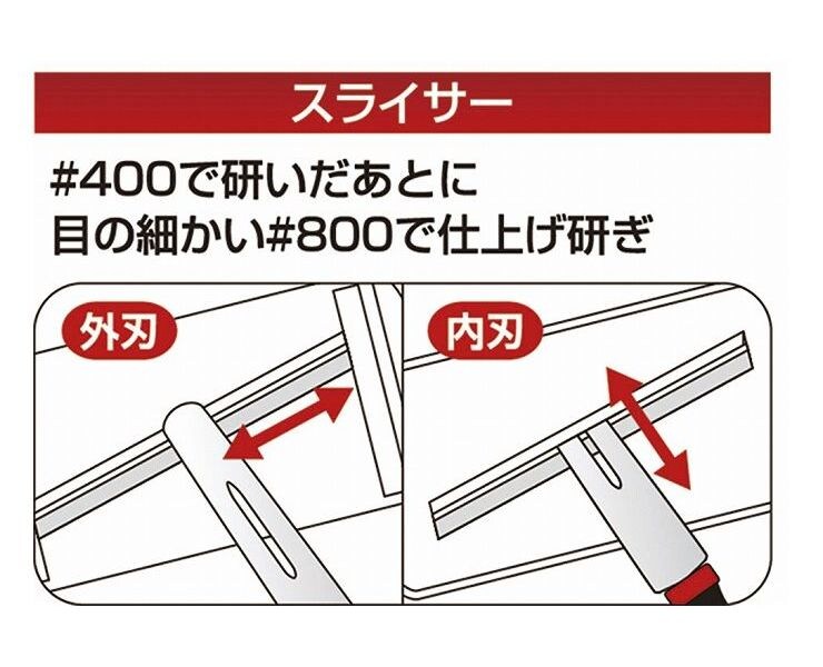 表面#400は包丁・ハサミ・鎌等に、裏面#800はスライサーの仕上げ磨きに。
